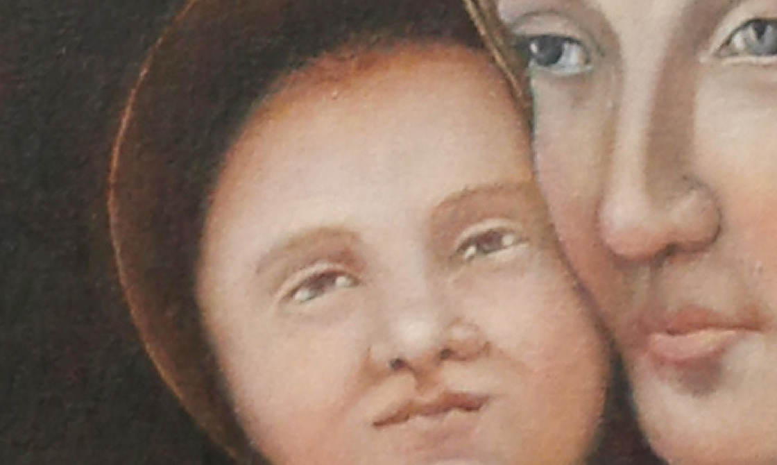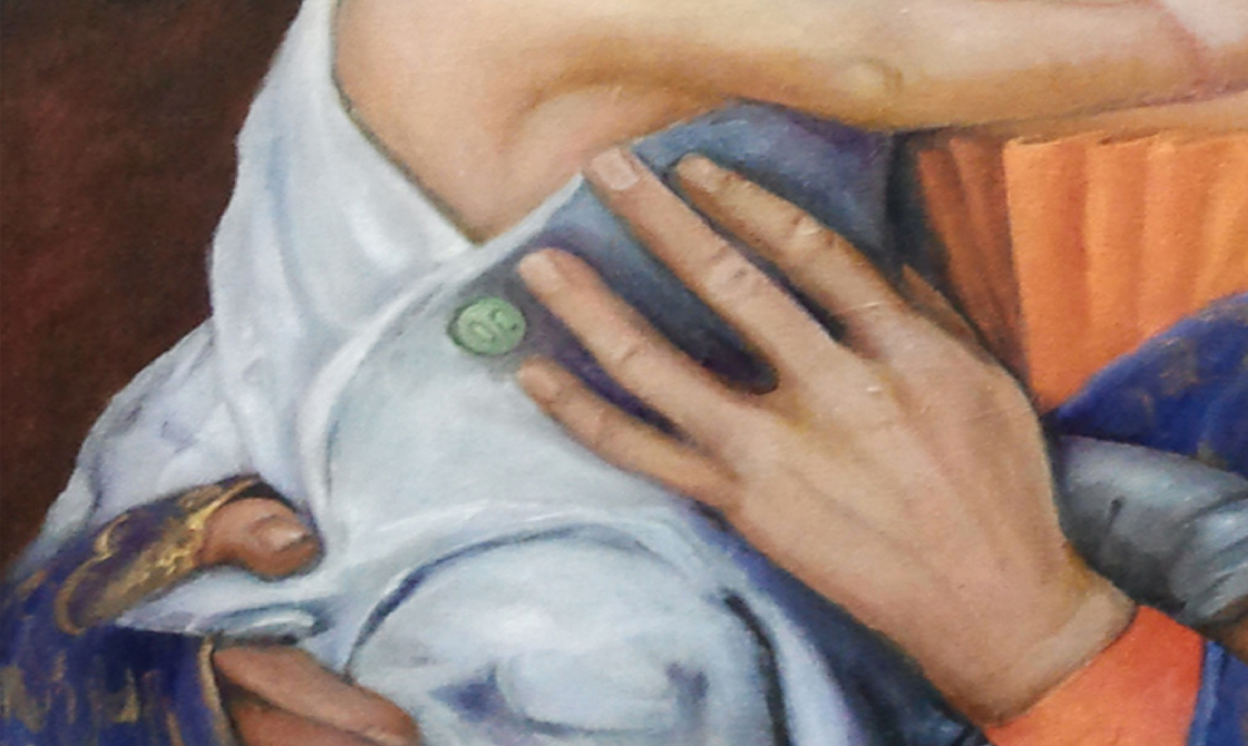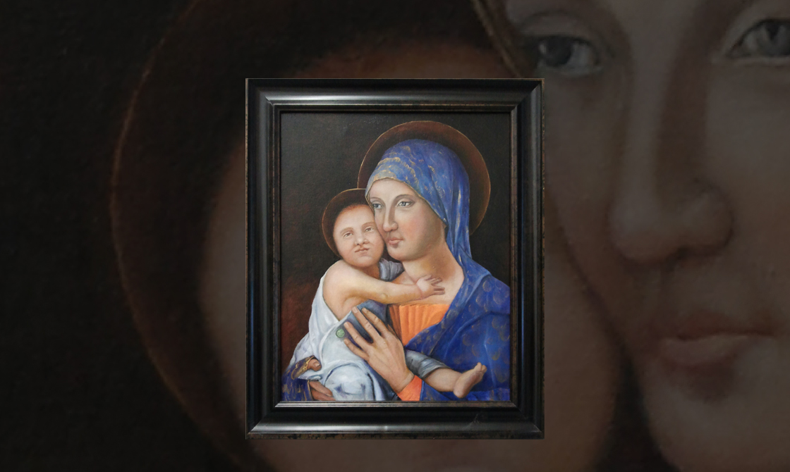 "In “Addiction Madonna,” based on a 1480 work by Andrea Mantegna, the green button on the infant Christ’s tunic is actually an OxyContin pill."